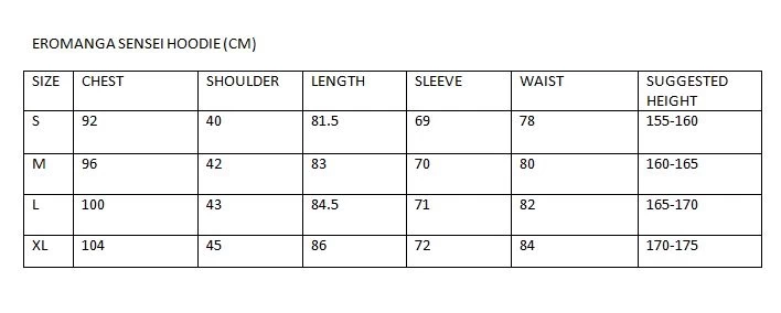 | SIZE | CHEST | SHOULDER | LENGTH | SLEEVE | WAIST | SUGGESTED HEIGHT |